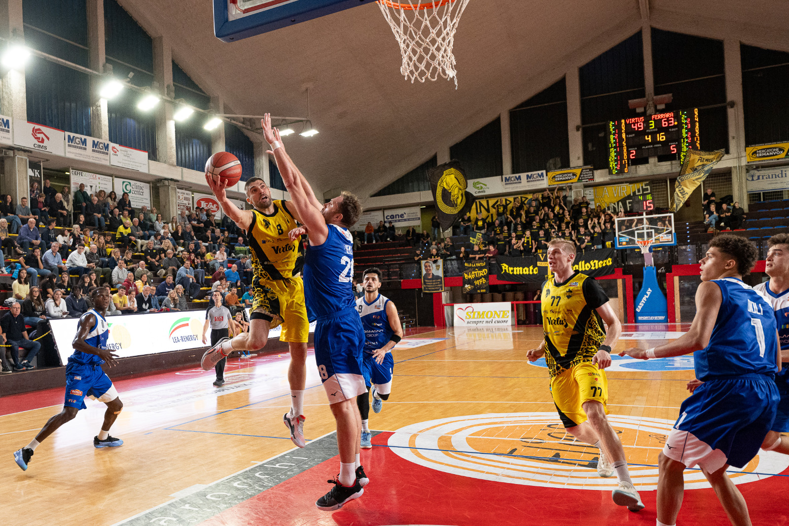 Virtus perde palle e terreno (37-52 al 22′). Kucan ci prova, ma è solo (Pollini troppo tempo seduto) e Ferrara va a +17 (49-66 al 26′). Torna Pollini ed è -11 (59-70).