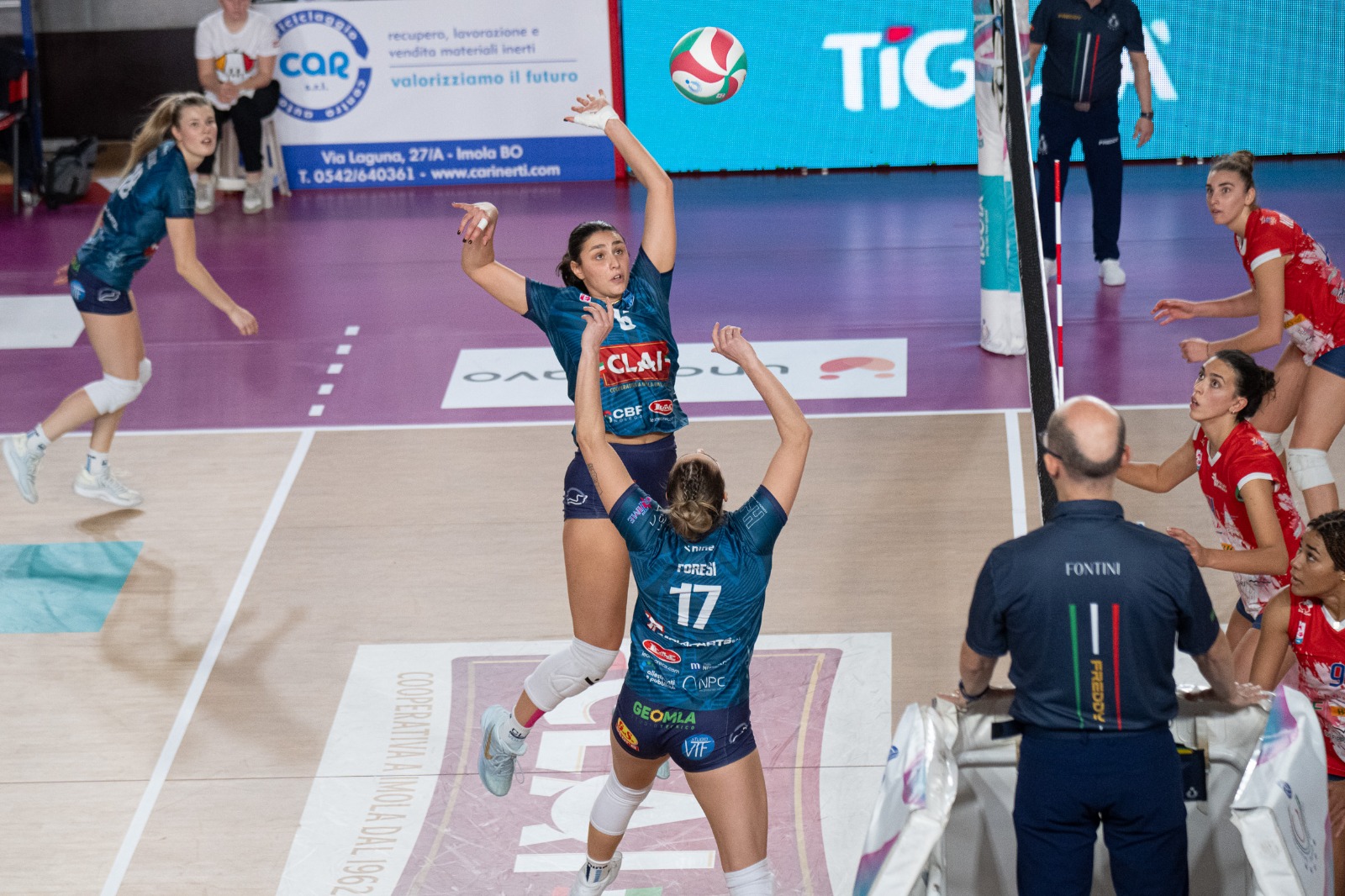 Il primo set Imola lo vince di squadra contro una Fusco incontenibile (8 punti). Il secondo lo perde dal 17-13 (parziale negativo di 12-2). Il terzo lo vince risalendo dall’1-5 (6 punti di Hoogers) nonostante i 9 di Visentin. Il quarto set lo sciupa con tante incertezze sul 19 pari.
