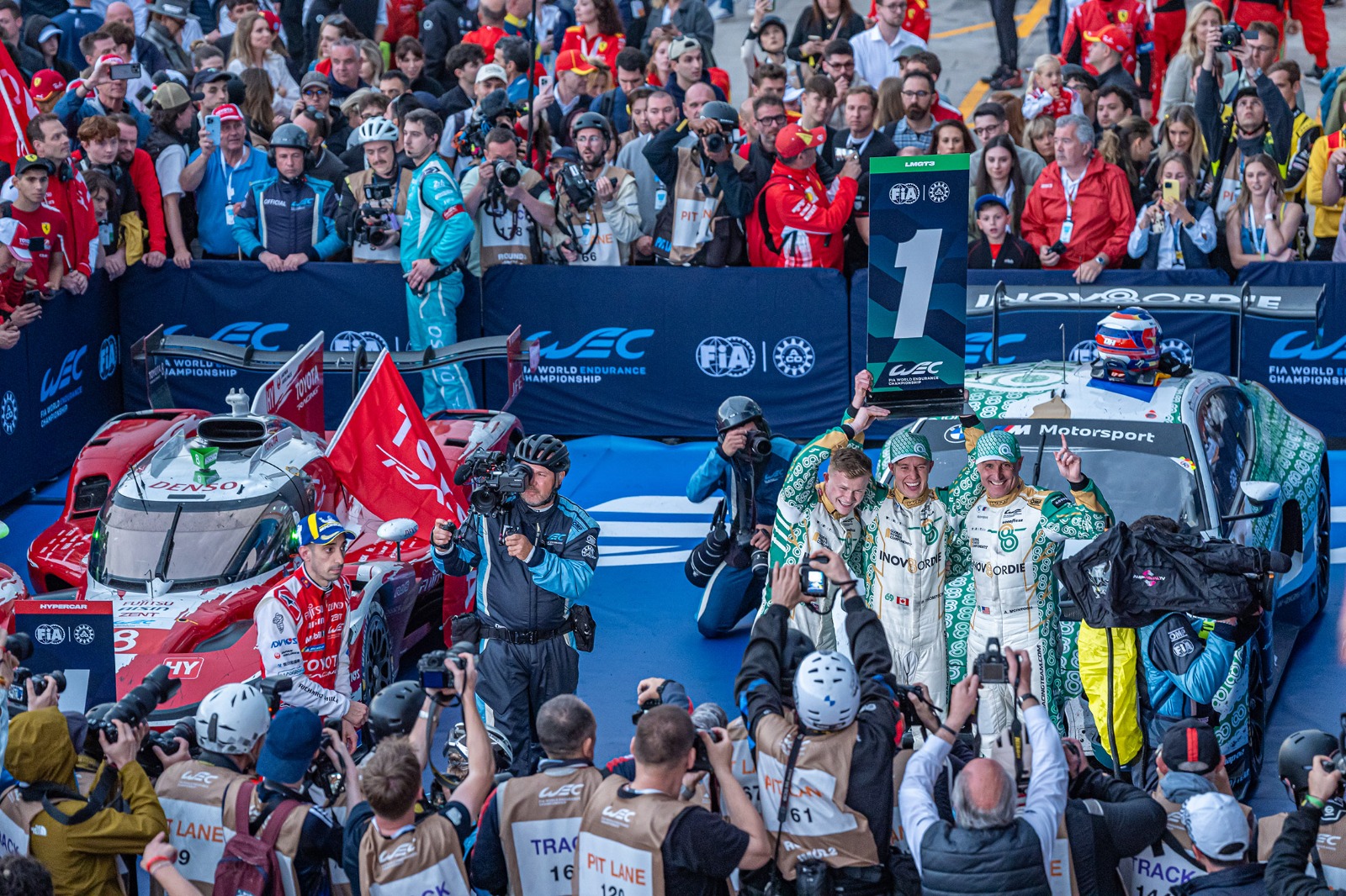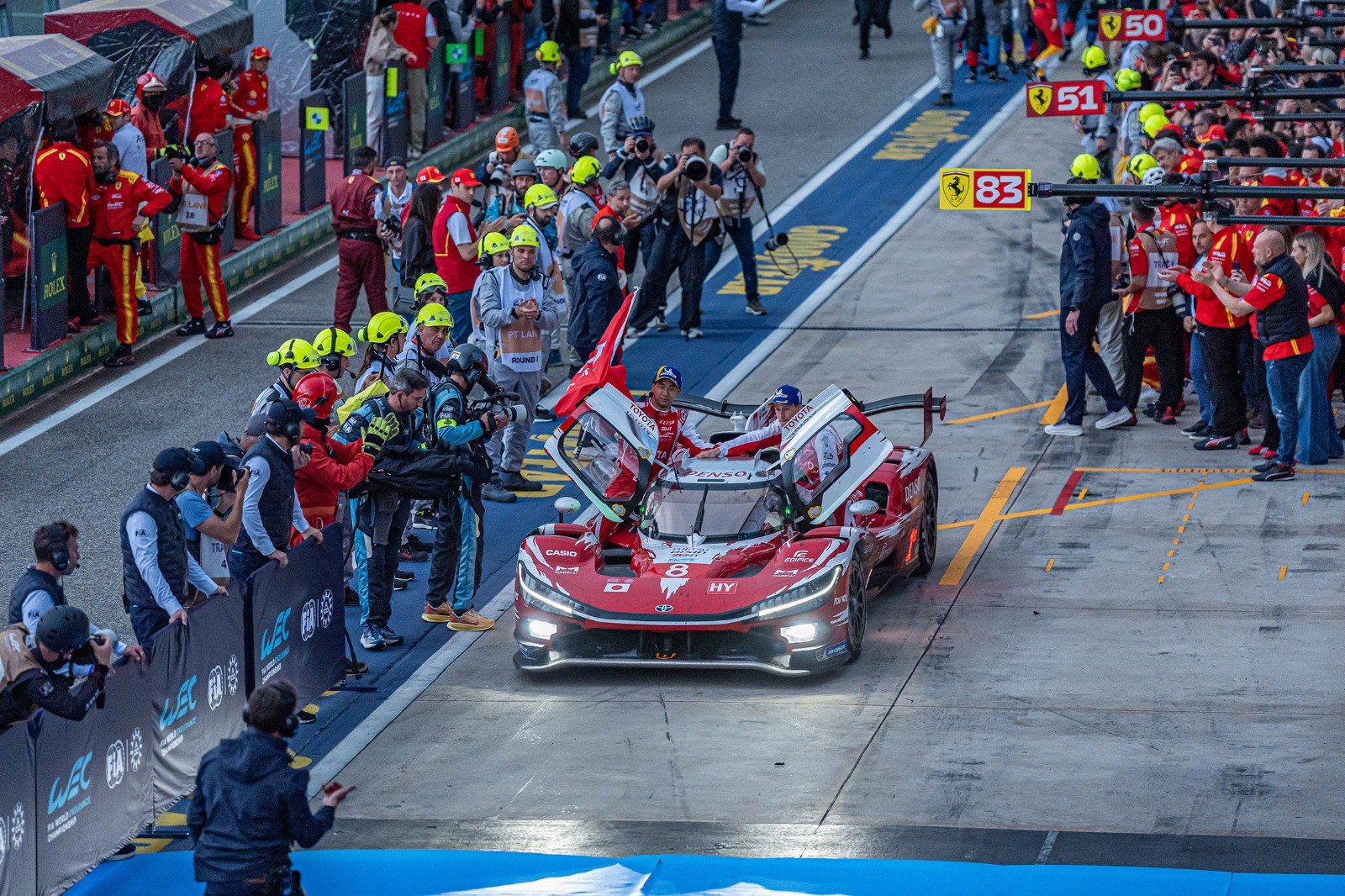 Emozionante la gara del Hypercar con il duello tra le due Toyota TR010 Hybrid e la Ferrari 499P campione del mondo in carica guidata dal terzetto Calado – Giovinazzi – Pier Guidi con la pioggia nel finale. Ha vinto la n° 8 giapponese guidata da Sébastien Buemi – Brendon Hartley – Ryo Hirakawa che ha preceduto di 13 secondi la Rossa di Maranello. Al terzo posto, a 41 secondi, la Toyota n° 7 del trio Conway – Kobayashi – De Vries. Top 5 completata dall’Alpine di Da Costa – Milesi – Habsburg e dalla BMW di Frijns-Rast.